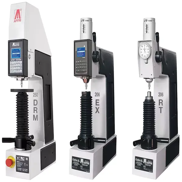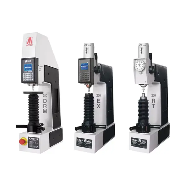 Máy đo độ cứng bán tự động dành cho các phương pháp kiểm tra độ cứng Rockwell, Superficial Rockwell, Brinell và Vickers tuân thủ các tiêu chuẩn ASTM và ISO. DRM, EX và RT là các máy đo độ cứng để bàn giá rẻ với tiêu chuẩn có độ chính xác cao. Để thực hiện kiểm tra, chỉ cần tác động lên vít nâng và đưa mẫu tiếp xúc với đầu đo, kéo cần gạt/nút ấn và trong vòng vài giây, kết quả sẽ xuất hiện. Lực tải được tác dụng thông qua hệ thống cảm biến tải trọng giúp loại bỏ các vấn đề liên quan đến hệ thống trọng lượng chết trên máy thử truyền thống: không bị ảnh hưởng bởi rung động và không cần phải cân bằng; hoạt động trong mọi điều kiện, thậm chí nghiêng, do Hệ thống Affri trong đó lực tải được tác dụng trực tiếp dọc theo trục của đầu đo mà không có tỷ lệ và đòn bẩy. Kiểm tra độ cứng trên tất cả các kim loại: sắt, thép, thép cường lực, gang, đồng thau, nhôm, đồng và hợp kim kim loại. Xử lý nhiệt, làm cứng, thấm nitơ, xi măng và làm cứng bề mặt.